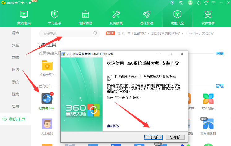 2.【360安装系统】:也可以用360安全卫士自带的,一键装系统程序安装,非常省心!对新手 小白比较推荐!